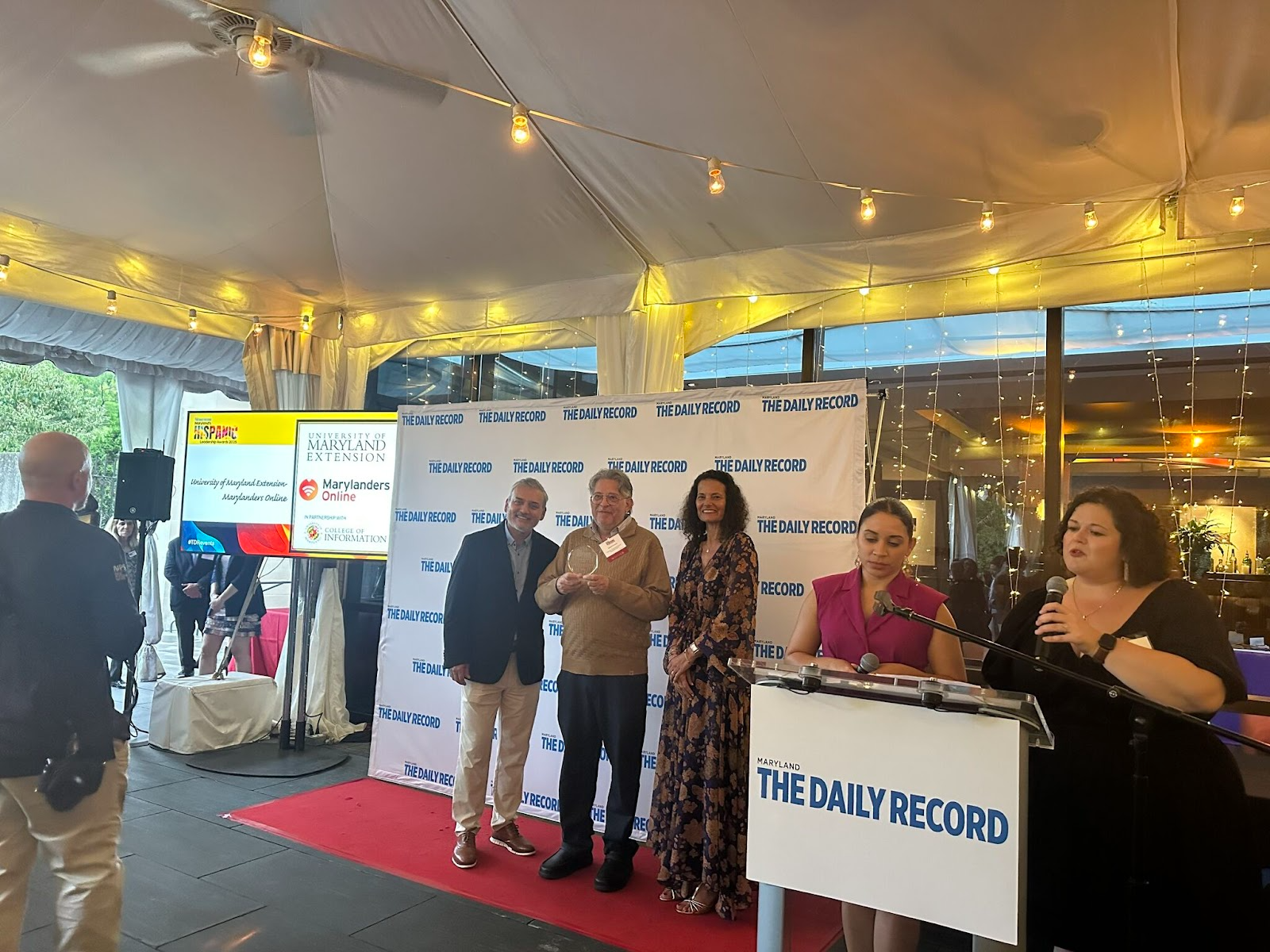 PICTURE 1: Dr. Jinhee Kim, Professor, UME Associate Director and Associate Dean, Gabriel Fumero, UME Marylanders Online Tech Educator, and Isaias Tesfalidet, Marylanders Online Project Director, receive the 2025 Maryland Hispanic Leadership Empowerment Award on September 25, 2025.