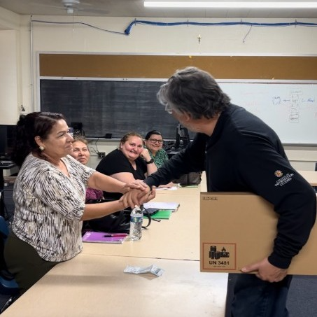 Picture 5: Esther, a Hispanic business owner, shakes hands with Gabriel after graduating from a UME computer class, sharing that she has overcome her fear of technology as a result of her new digital skills.