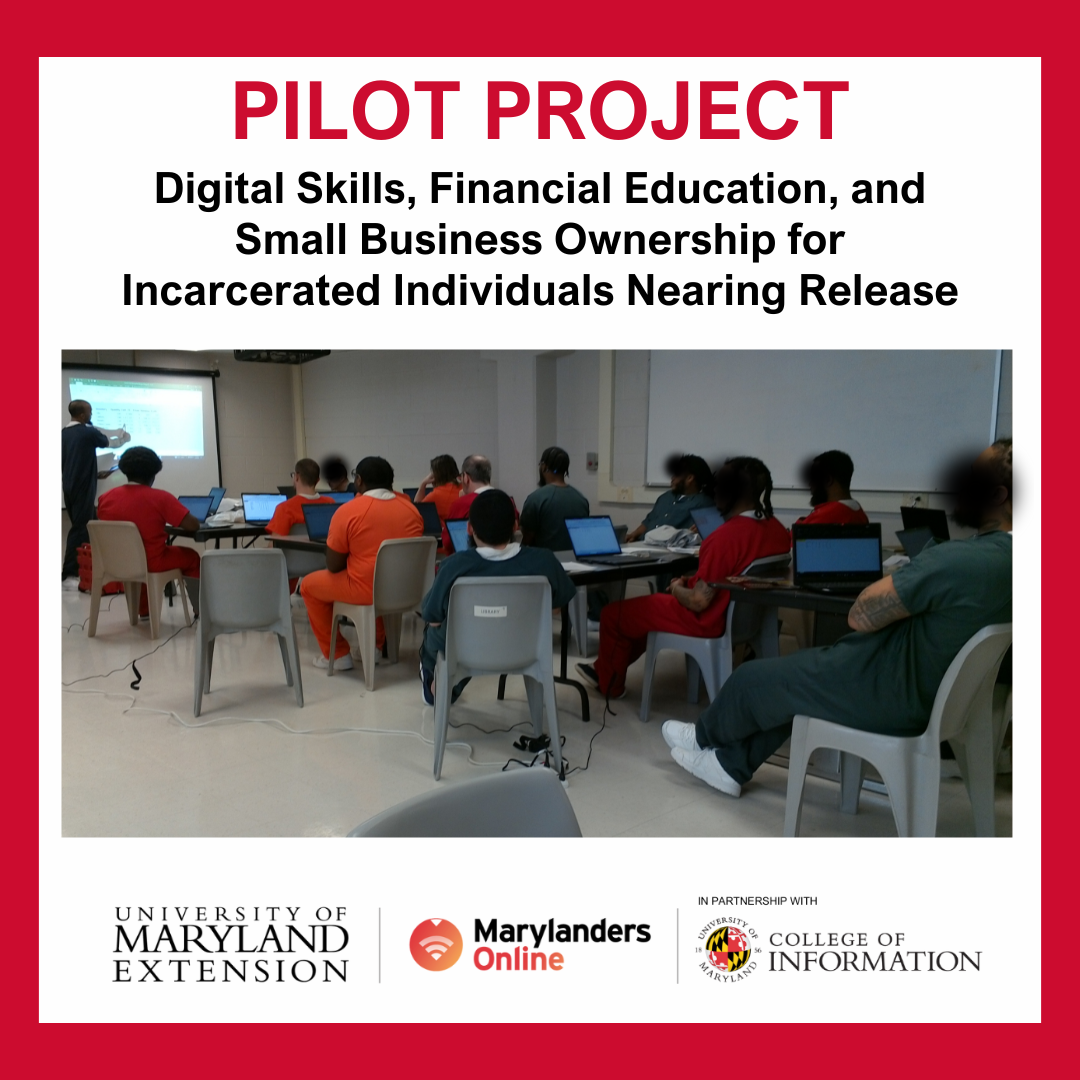 pilot project funded by UME Marylanders Online achieved remarkable success at a Maryland prison. Twenty-one incarcerated individuals nearing release completed a six-week “Digital Skills Financial Education and Small Business Ownership” course, learning business and economic concepts to prepare them for future employment opportunities. The program was taught by Extension Agent Michael Elonge, who will be posthumously awarded the Digital Equity Champion Impact Award at the 2025 Maryland Digital Opportunity Summit.